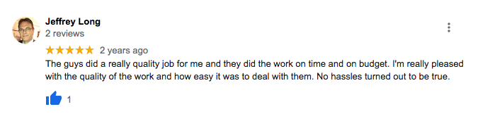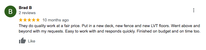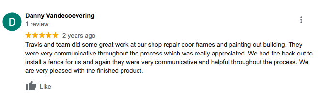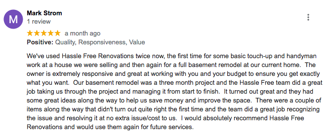 "Travis and his team were a dream to work with. From the start, he was responsive and knowledgeable with all repairs I needed on my home. He came in with two additional helpers and worked very quickly—but don't mistake that for how thorough they are. I will definitely work with Hassle Free Renovations again."
